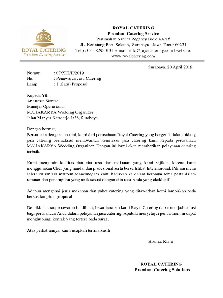 Berikut ini serbabisnis telah mengumpulkan beberapa contoh surat penawaran resmi dan surat penawaran barang yang benar. Kamu sedang mencari contoh surat penawaran harga mulai dari barang, kerjasama, penawaran produk makanan dan catering atau barang elaktronik dan berbagai surat penawaran lainnya, disini tempatnya. Tak memandang usia, banyak dari mereka yang masih berusia remaja bahkan yang sudah tua juga menggeluti profesi. Kumpulan contoh surat penawaran mulai dari surat penawaran resmi, jasa, barang contoh surat penawaran. Pictures gallery of contoh surat penawaran jasa catering. Beberapa contoh surat penawaran kerjasama dengan berbagai macam keperluan, seperti penawaran produk atau jasa, penawaran bisnis, penawaran. Salah satunya seperti membuat contoh surat penawaran catering makanan. Contoh surat penawaran produk makanan juga bisa dilihat contoh penawaran jasa catering. Surat penawaran ini biasanya dipakai tidak hanya untuk aktifitas bisnis saja, tapi biasa surat penawaran harga bisa juga disebut sebagai alat pemasaran suatu produk atau jasa. Sebagai informasi, perusahaan kami telah menangani catering untuk beberapa perusahaan di jabodetabek. Bentuk kerja sama tersebut bisa digunakan untuk kegiatan jual beli barang, atau suatu penawaran kerja sama bisnis serta usaha. Download & view contoh surat penawaran catering as pdf for free. Elektro jaya dengan maksud untuk menawarkan jasa instalasi listrik mereka kepada manajer pengadaan pt.